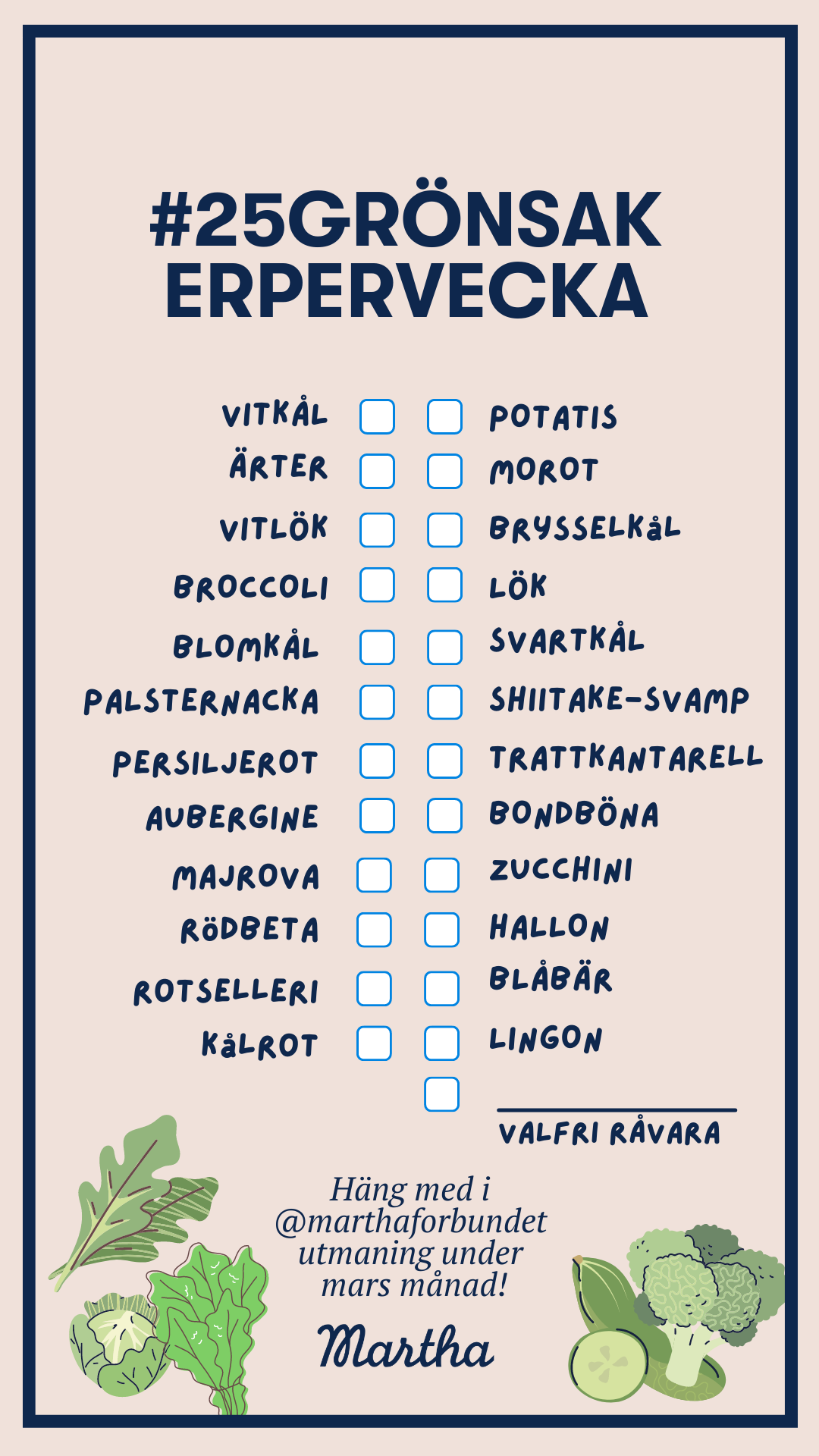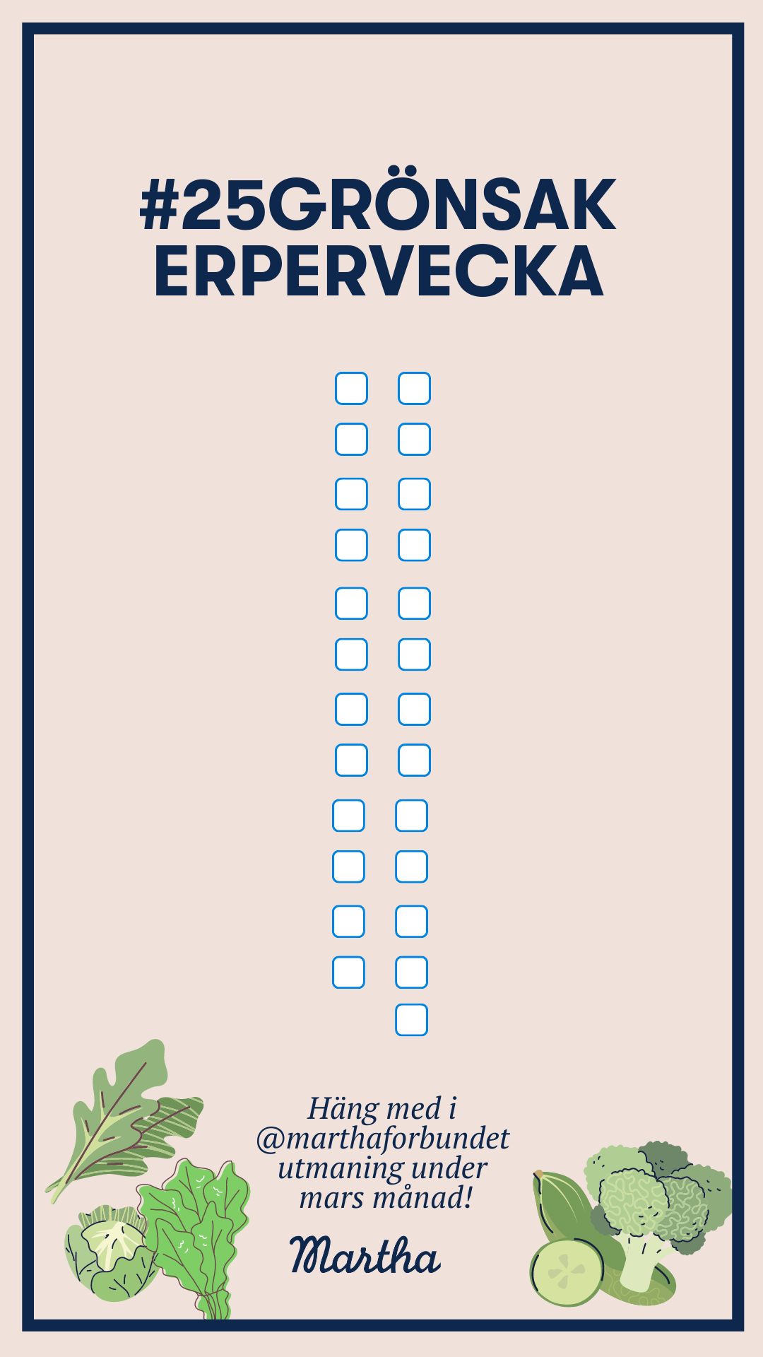 Inspirera andra genom att dela hur det går för dig! Använd gärna hashtagen #25grönsakerpervecka och tagga @marthaforbundet, så delar vi vidare!