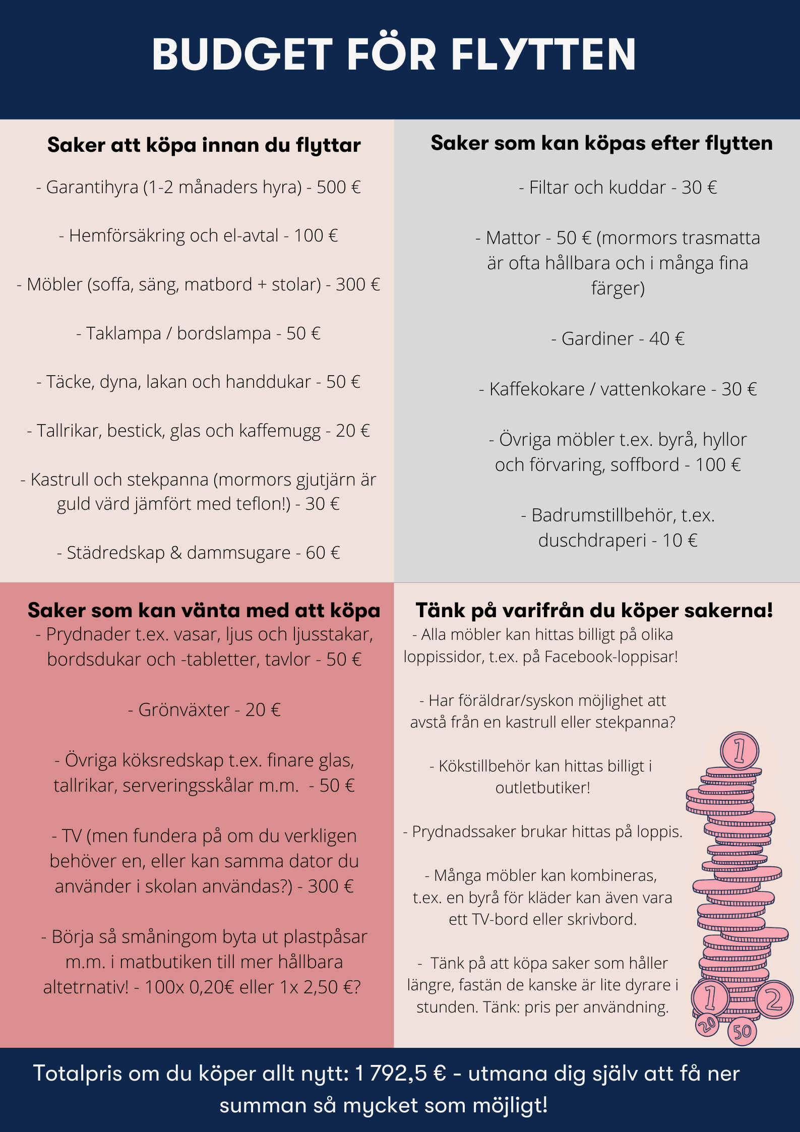 Tips! Fundera på vad som du behöver och vad som du vill ha. Du kanske klarar dig utan en hel del som du trodde var nödvändigt? Du behöver heller inte skaffa allt genast när du flyttar in.