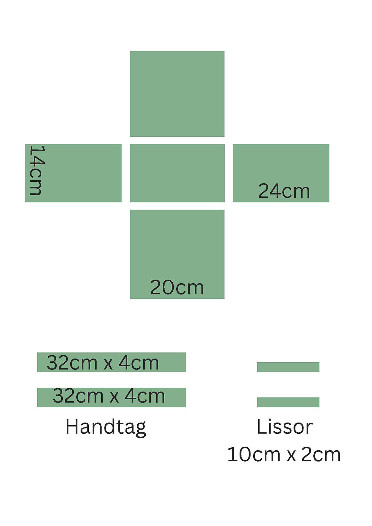 Huvuddelar: 20 cm x 24 cm (fram- och baksida), 14 cm x 24 cm (botten)
