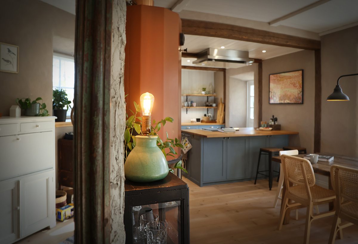 Atmosfären i huset är varm och akustiken dämpad – kanske tack vare de genuina materialen, den personliga inredningen och de munblåsta fönsterglasen som ger vackra skiftningar.