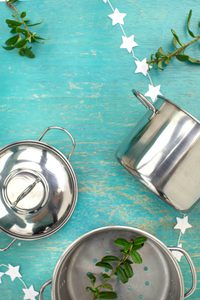 - Kökskärl och -redskap i rostfritt stål och trä framom plast till lekhörnan med kök.