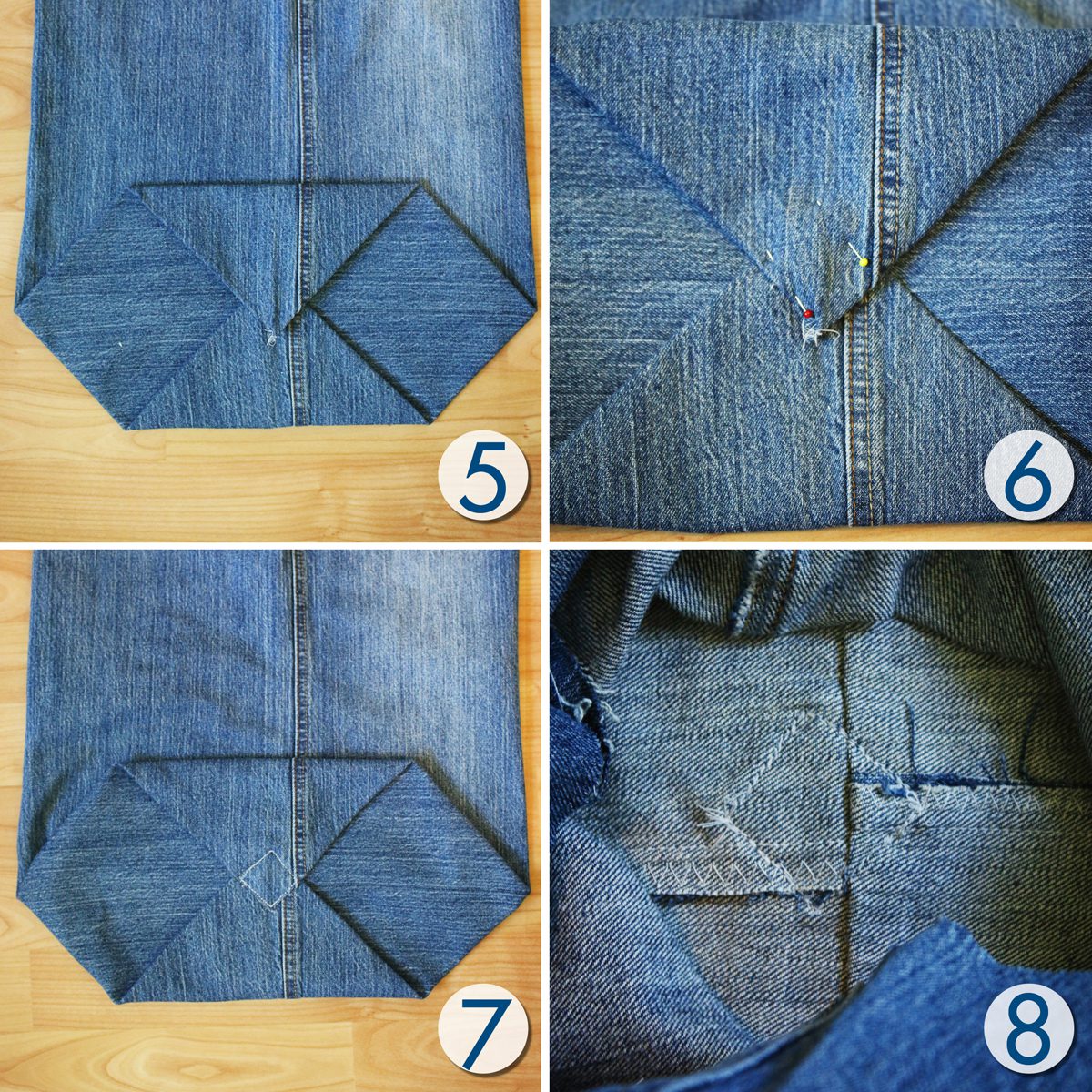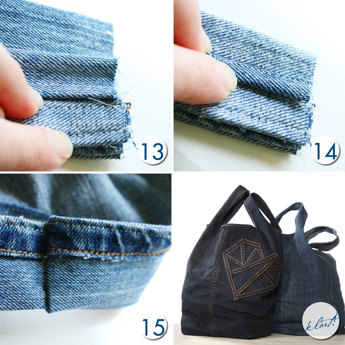 Ett par gamla jeans förvandlas till en hållbar och rymlig marthakasse perfekt att ta med till matbutiken.