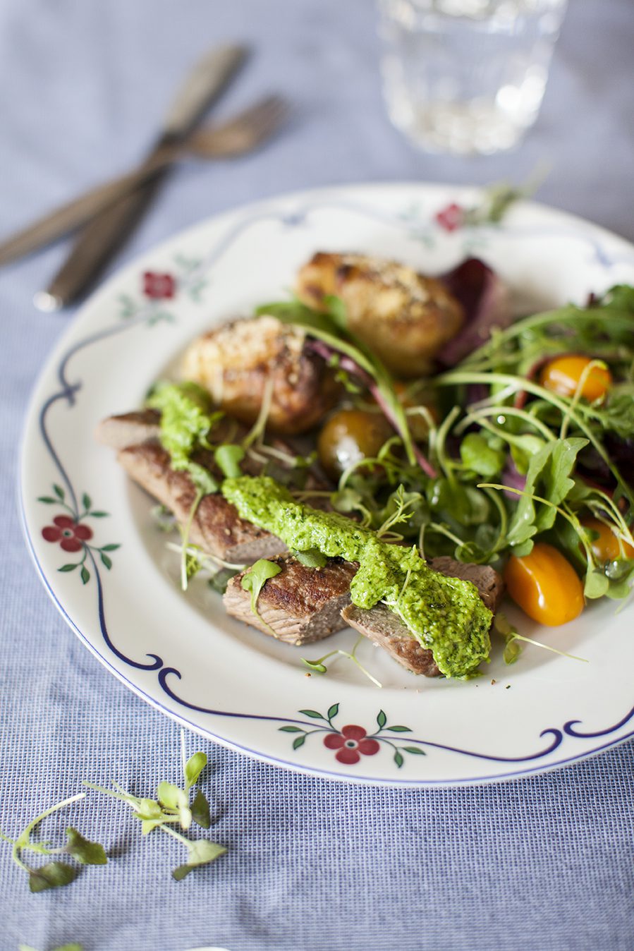 varmrätt: lammfilé med ärtskottpesto & hasselbackspotatis,