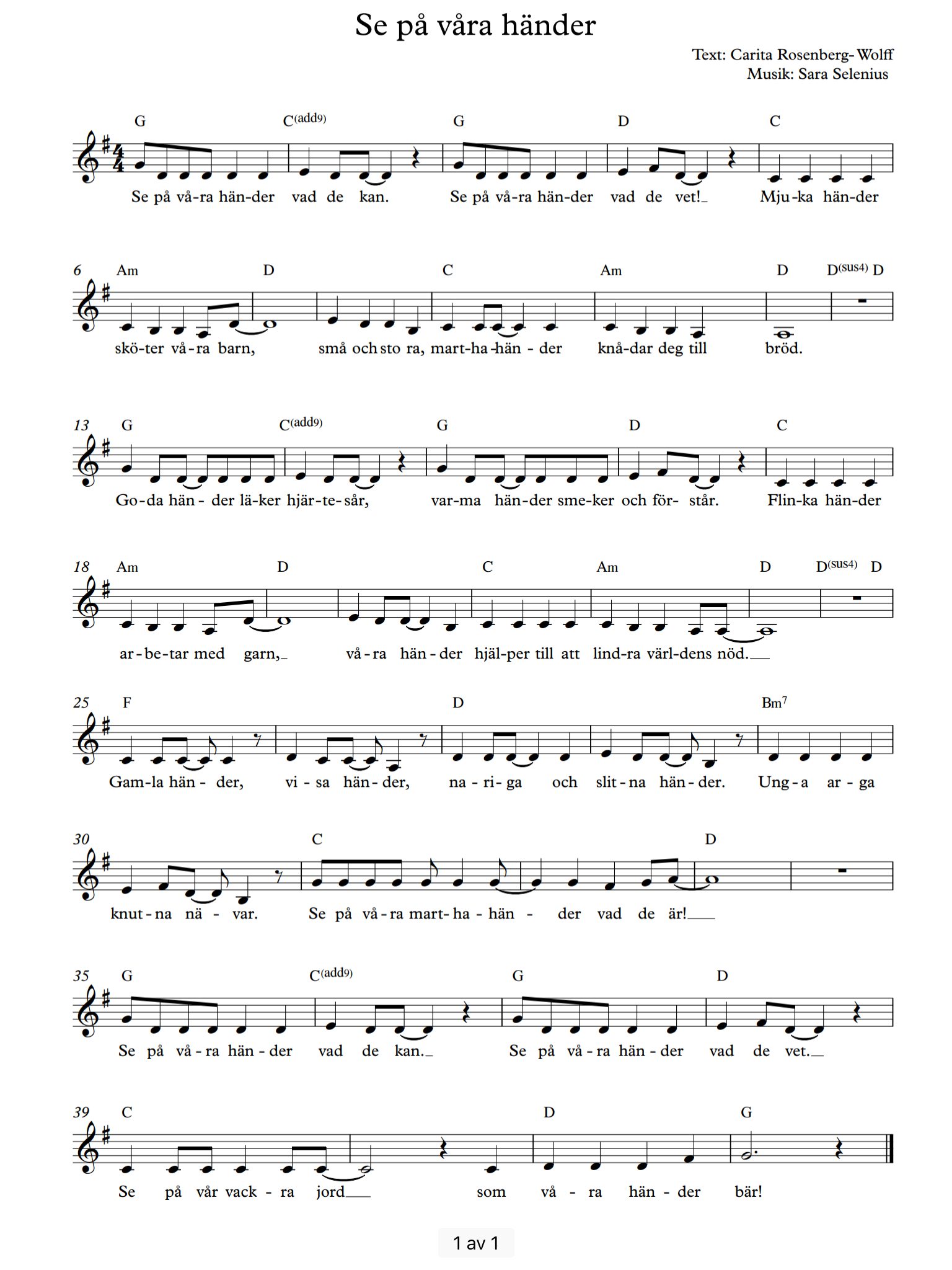 "Här möter martharörelsens sekellånga traditioner dagens marthor i en tilltalande sång, som slagkraftigt gestaltar rörelsens grundtanke. Upphovskvinnornas val av händer som tema öppnar för såväl konkreta bilder som fina metaforer. Melodin är lättsjungen, texten lätt att komma ihåg, och det korta formatet gör sången idealisk som lystringssång. Text och tonsättning passar varandra som hand i handske och bildar en medryckande, modern helhet. Se på mina händer har alla förutsättningar att både höja stämningen vid olika sammankomster och fungera som Marthaförbundets musikaliska signatur."