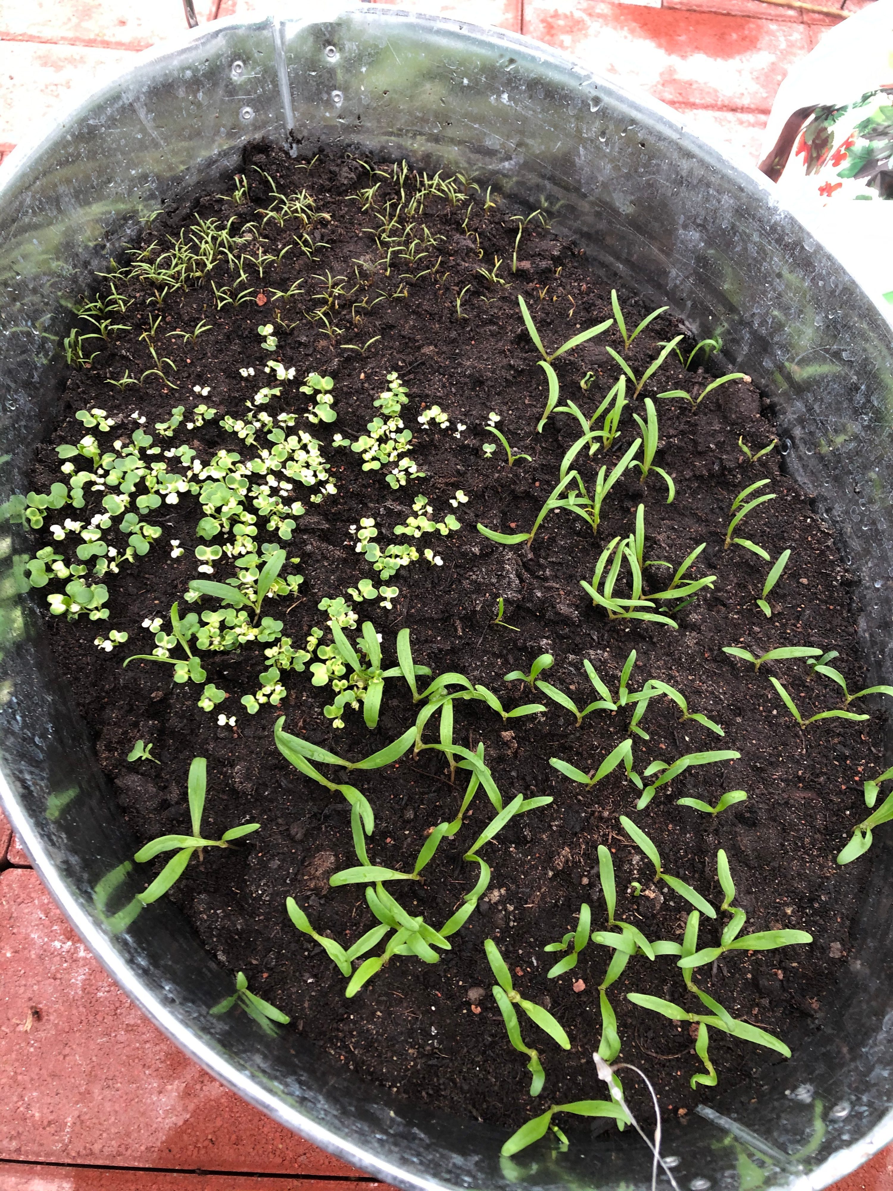 Låt sådden stå ute i väntan på skörd eller på en inglasad balkong eller i ett växthus där tillväxten sker snabbare. Täck sådden med en fiberduk för att skydda för kallare temperaturer och för att jorden ska hållas jämnare fuktig. Se till sådden och vattna vid behov. Skörda bladen vartefter de blivit tillräckligt stora och avnjut till exempel i en sallad eller på en smörgås med färskost eller hummus. En pesto blir även god på olika blad och örter.
