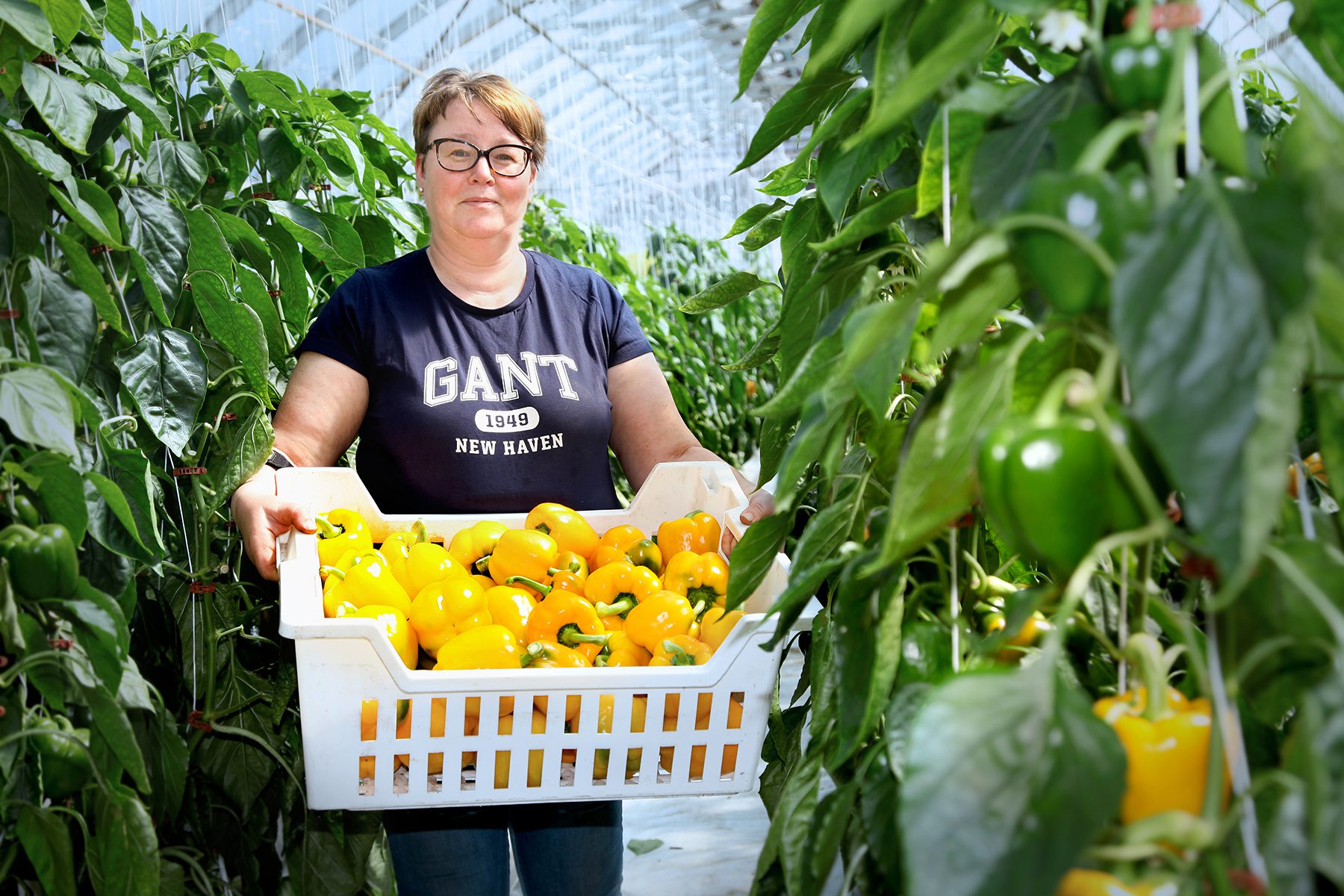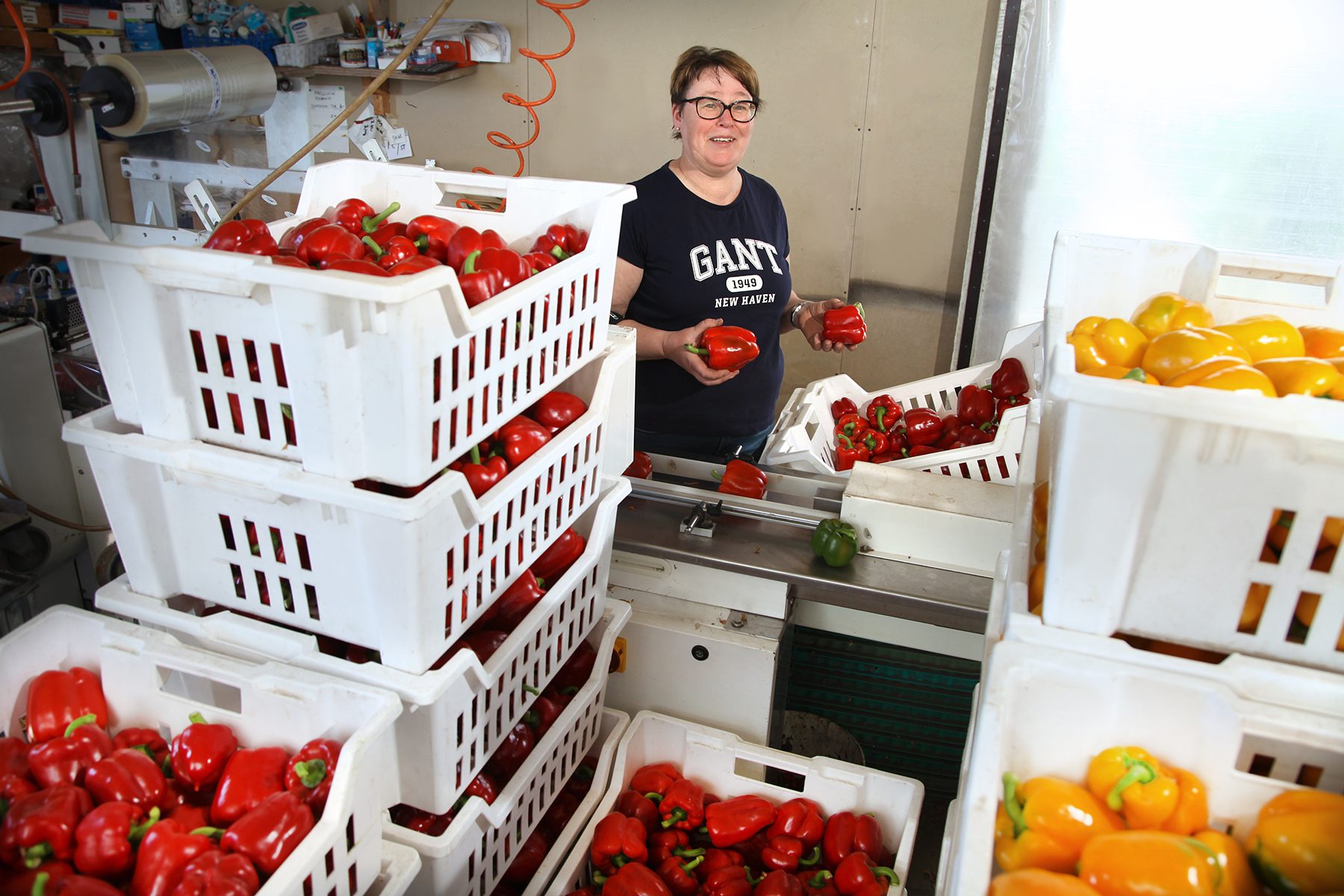 – Under högsäsongen plockar vi över tusen kilo i veckan, berättar hon. Vi plastar in paprikorna var och en för sig med hjälp av en packmaskin.