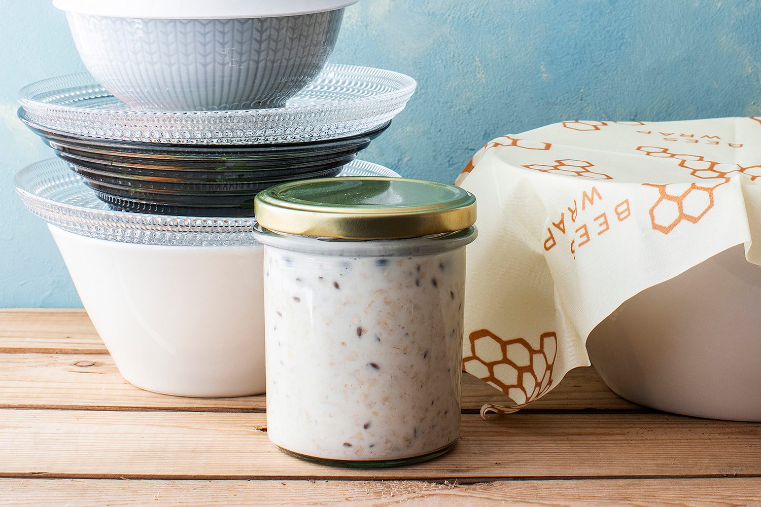 Förvara matrester i vanliga porslinsskålar och glasburkar i kylskåpet. En tallrik funkar bra som lock.