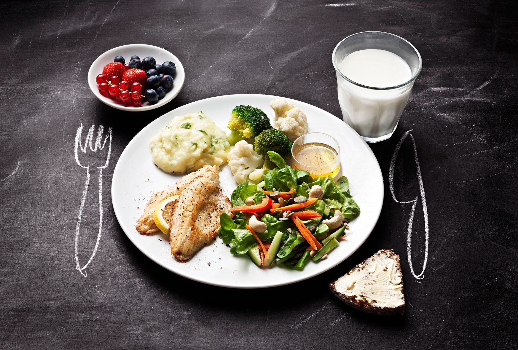 • Det är också viktigt att dricka till maten. Drick vatten för att släcka törsten och drick gärna ett glas mjölk eller surmjölk till. Till efterrätt kan du äta en frukt eller en liten skål med bär.
