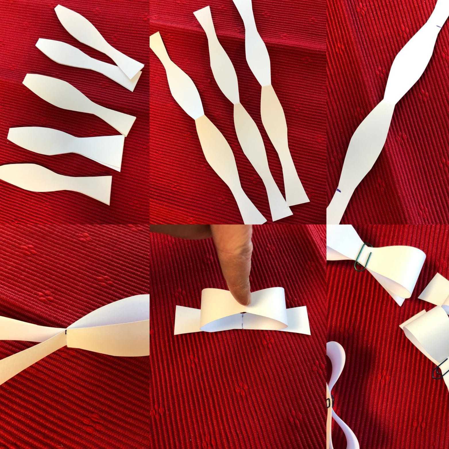 Vik ett papper på hälften. Placera fiskens huvud mot den vikta kanten så, att det blir ungefär en centimeter vikt kant kvar då man klippt ut fisken ur det dubbelvikta pappret. Vik sedan upp "dubbelfisken" och klipp ett litet hack vid stjärtarna, på ovansidan på den högra fisken och på nedre sidan på den vänstra fisken. Fäst hacken i varandra så blir det en rosett! Se bilderna. Lycka till!
