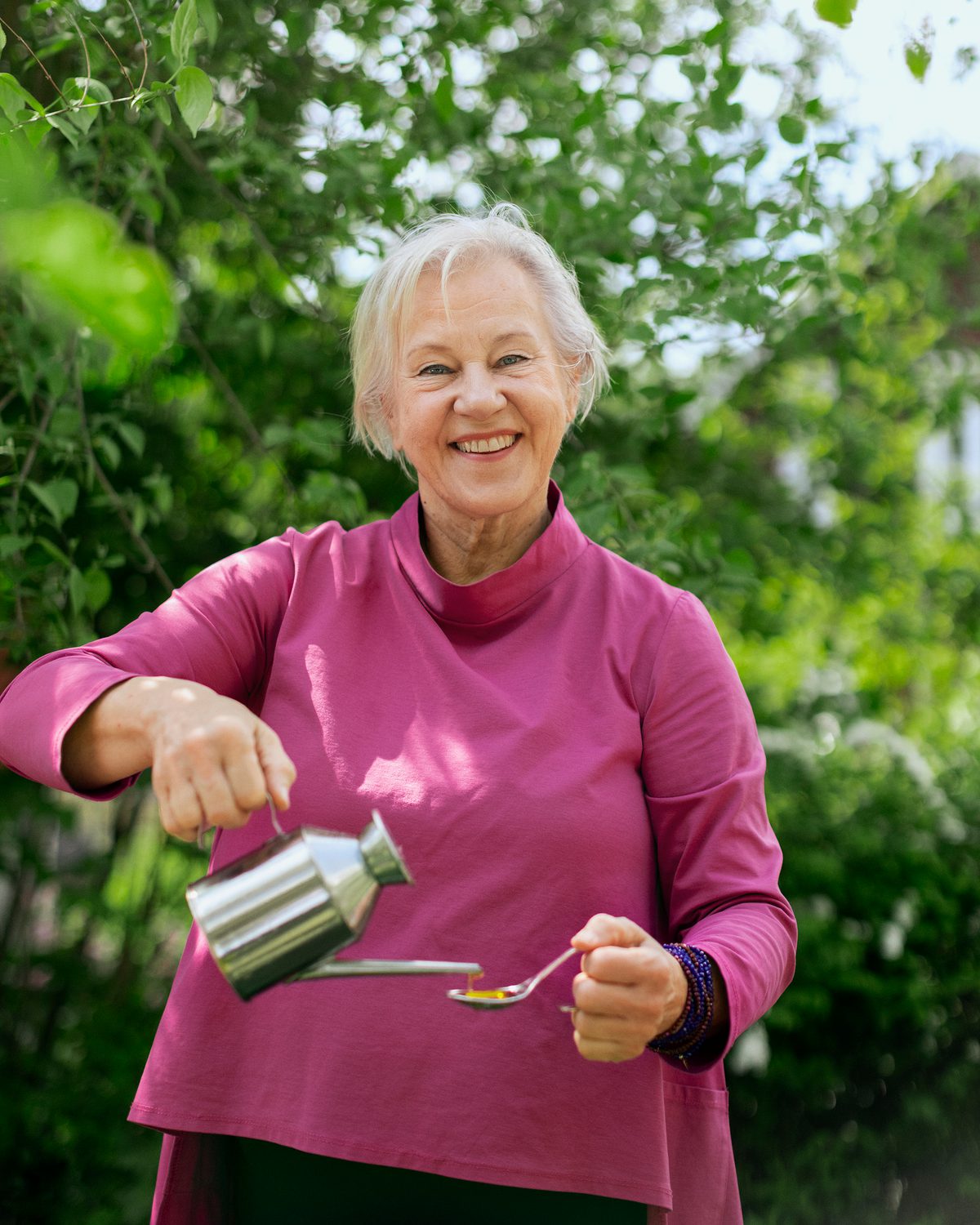 Olja passar också som en smaksättare eller ett näringstillskott på gröten tillsammans med frön och bär. Till bakning använder Kuusipalo alltid flytande margarin eller olja, som hon tycker att ger bakverken längre hållbarhet.