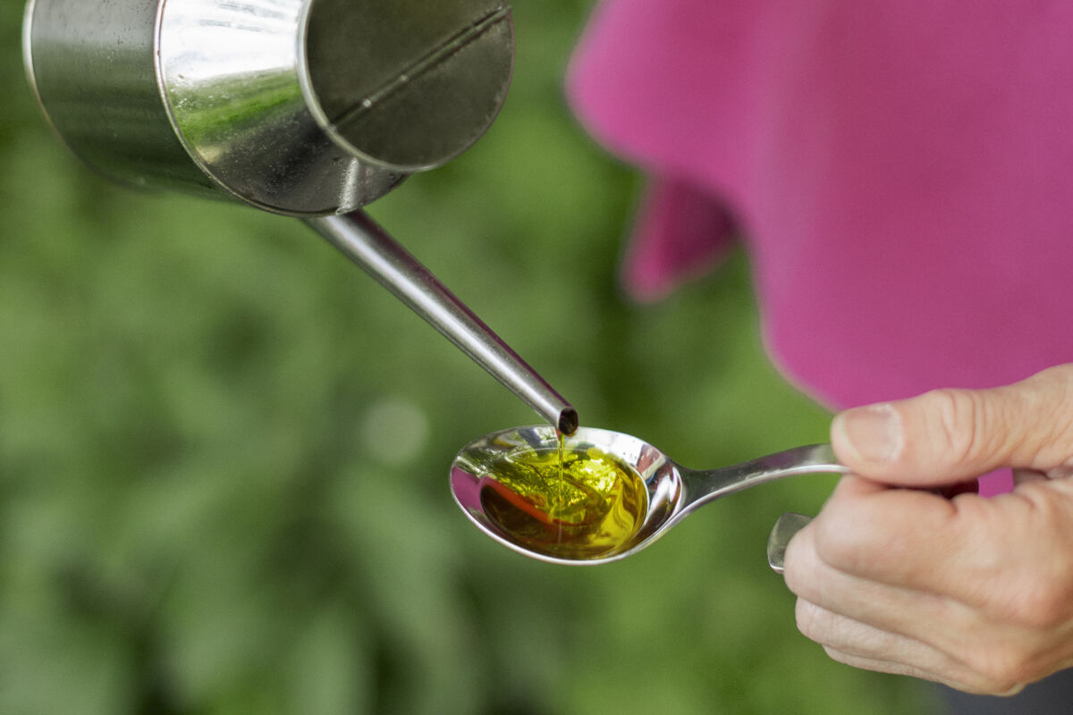 I hennes eget skafferi finns inhemsk rybs- och rapsolja för daglig matlagning, kallpressad olivolja från den egna gården för smaksättning och dressing, en liten flaska pistageolja från Frankrike som passar för desserter, mandelolja som också kan användas för hårvård, en lokalproducerad smaksatt rybsolja med vilda örter och ett kross av oljehampafrön som innehåller såväl protein som goda fetter.