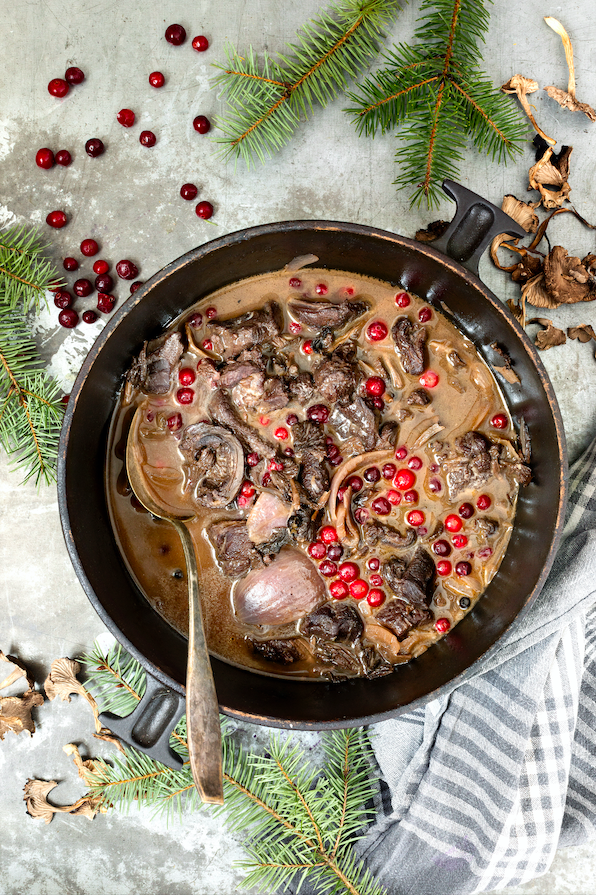 - Låt grytan puttra på svag värme i 1–1 ½ timme (beroende på köttets mörhet). Tillsätt tranbären och låt småkoka ytterligare 1 timme. Tillsätt persilja. Smaka av. Servera med ugnsbakade rotsaker och potatis.