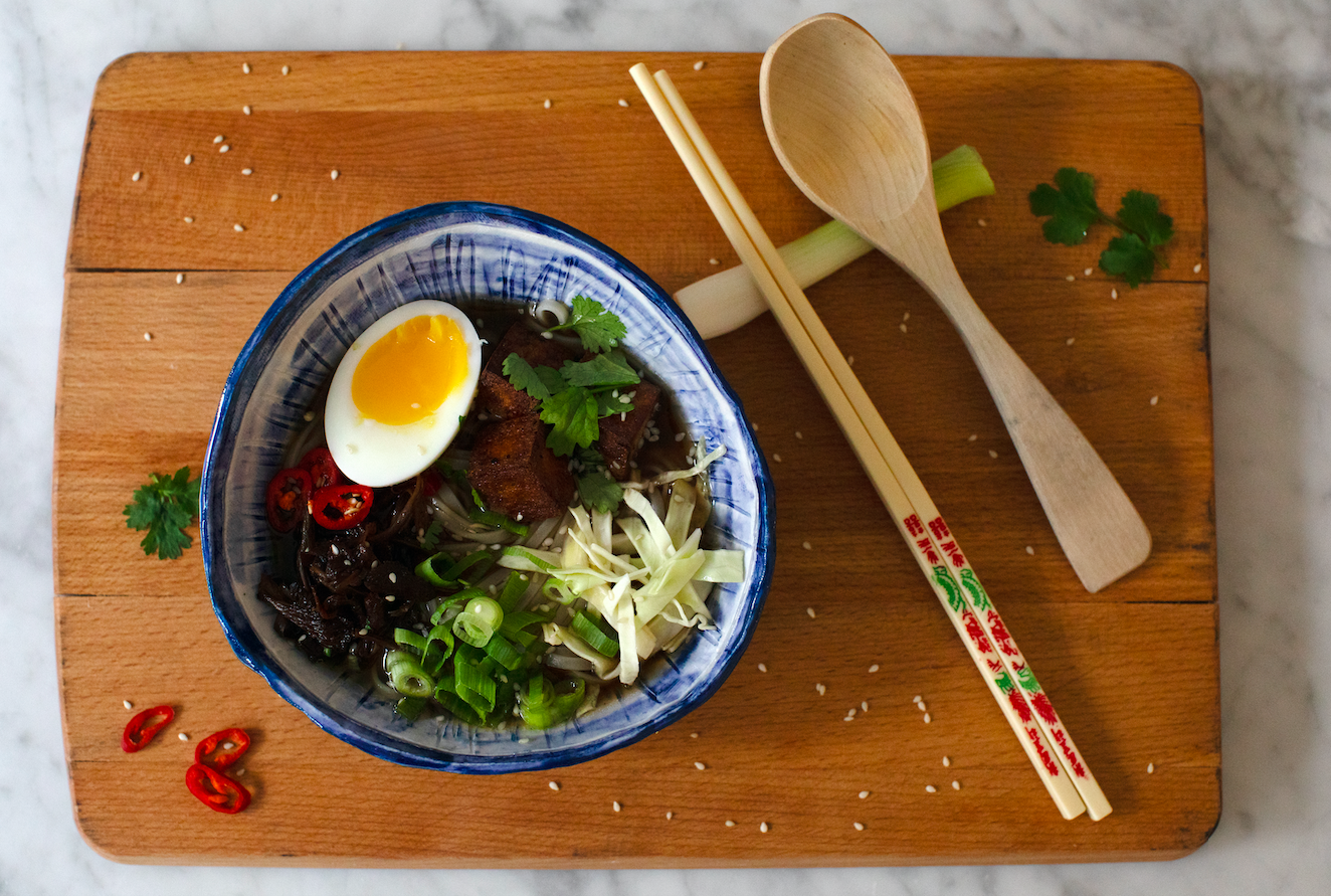 - Häll på den varma buljongen så det täcker nudlarna. Skala och dela äggen, lägg på resten av ingredienserna till nudelsoppan och droppa över sesamolja.