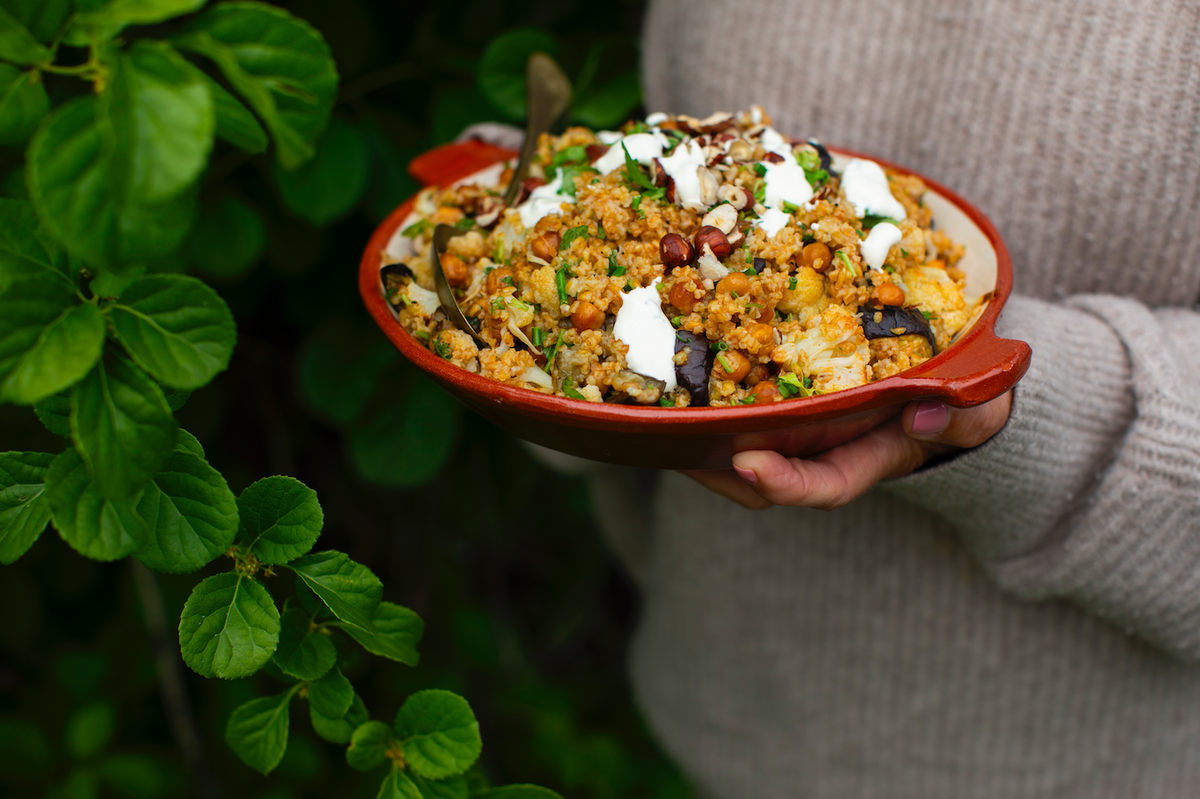 Bland annat den här varma enkornssalladen med ugnsrostade grönsaker hittar du i årets magasin.