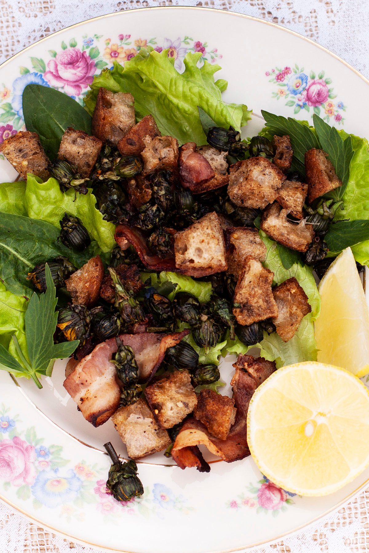 Maskrosknoppar passar även fint att äta tillsammans med brödkrutonger och bacon.
