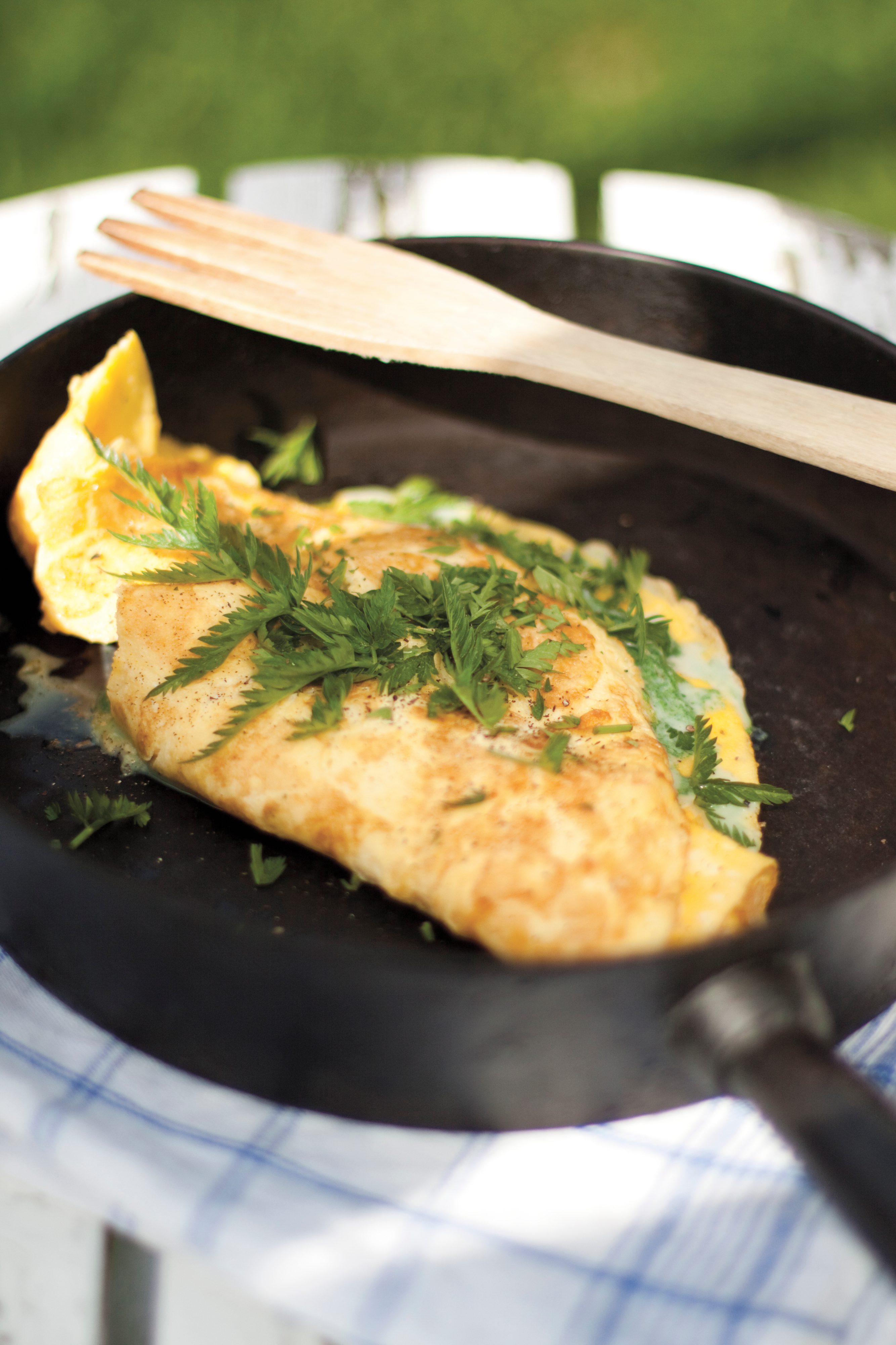 Berika omeletten med en eller flera olika vilda grönsaker. Har du mycket kirskål i trädgården vet du att den inte tar slut i första hand. Ta som vana att dagligen plocka en näve för att piffa upp maten.