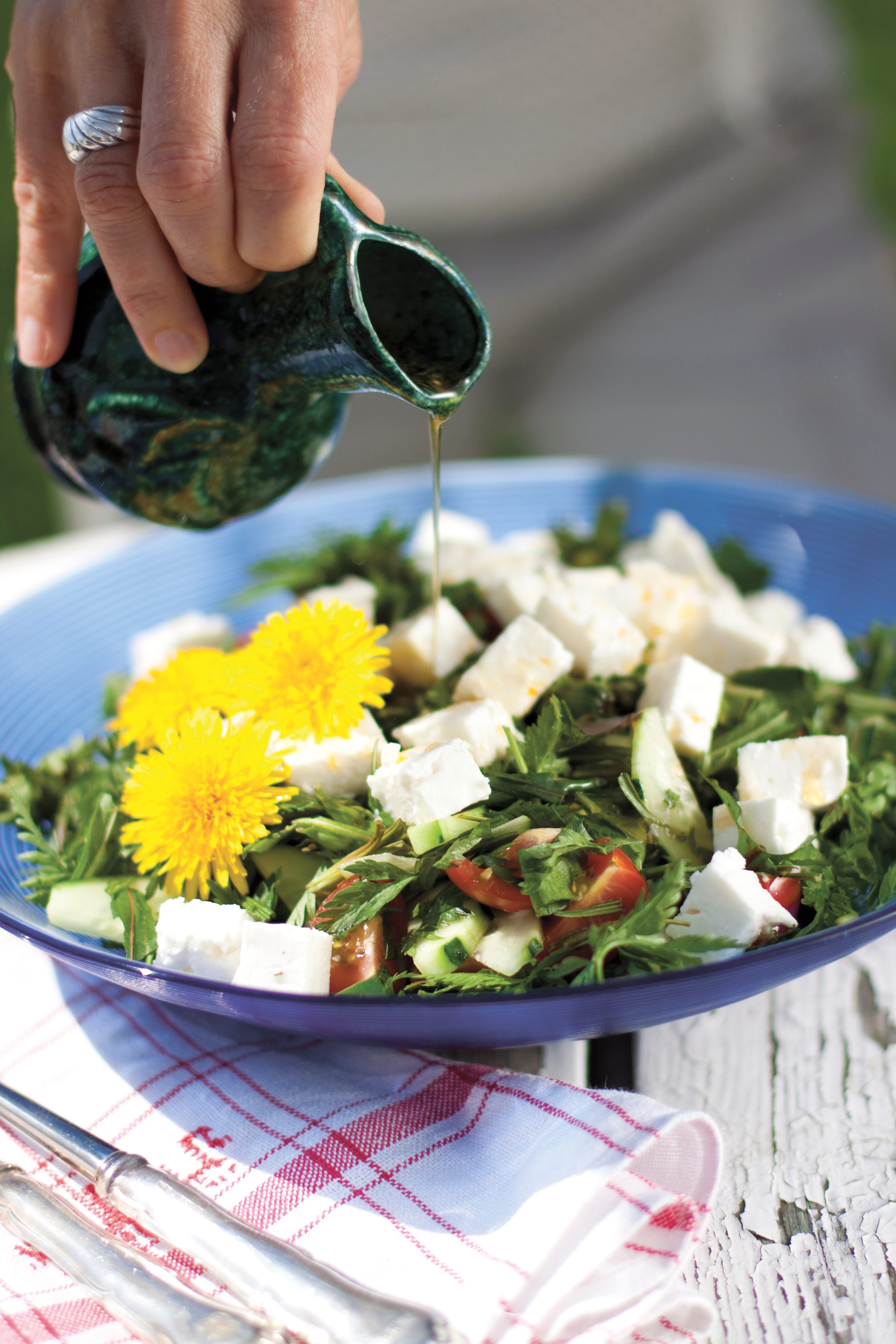 Salladen blir god då du mixar vilt och tamt och droppar över en salladsdressing med rölleka.